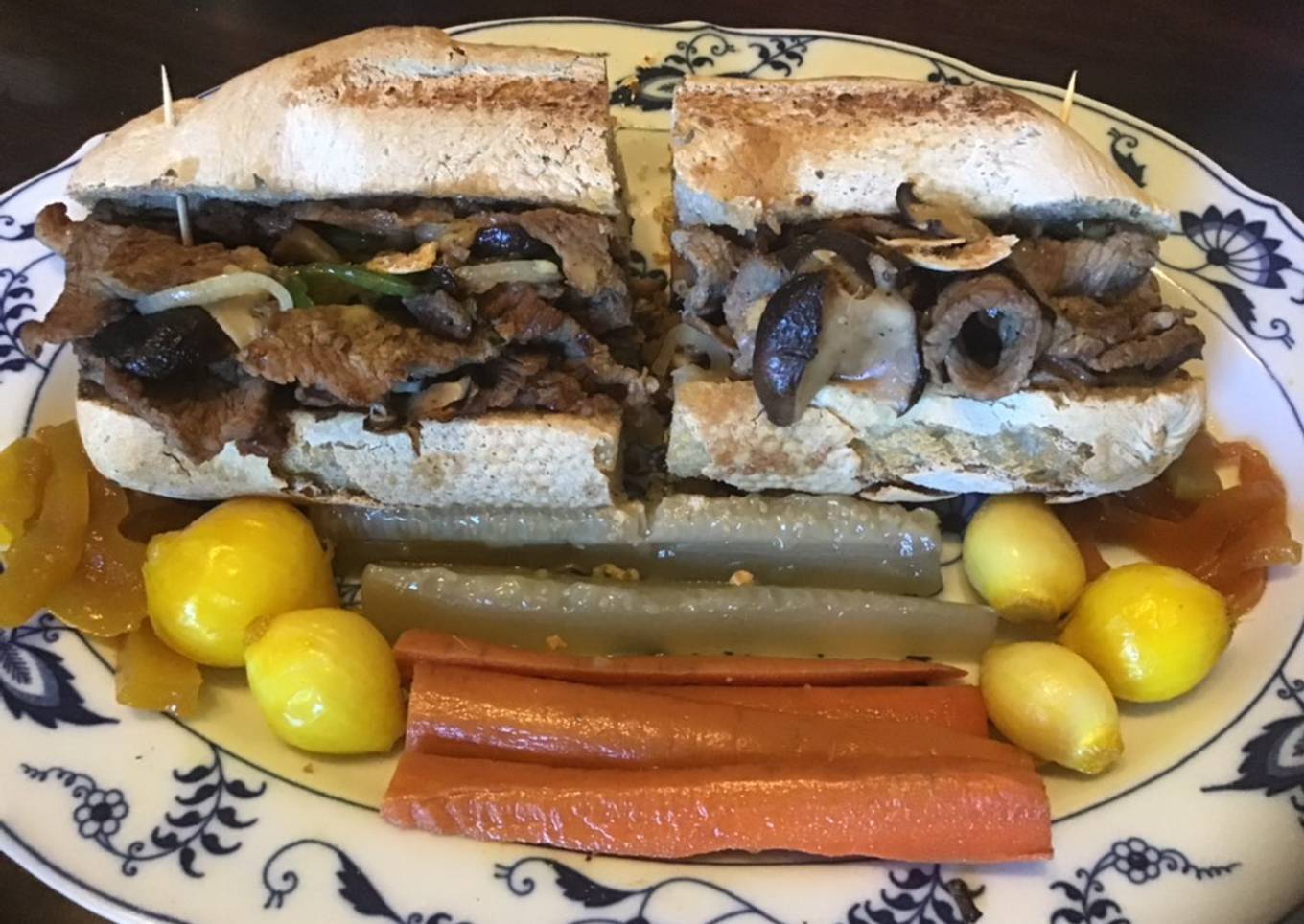 - Fill warm sour dough roll with hot beef and cheese mix, toothpicks on top to keep closed, cut in half. Serve with pickled carrots, cucumber, boiler onions or sweet peppers on the side. Enjoy.